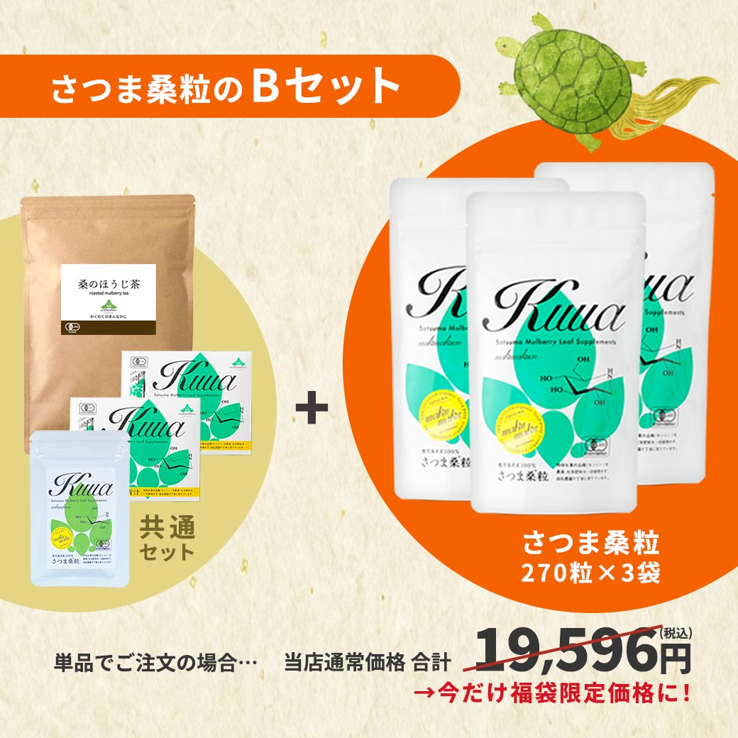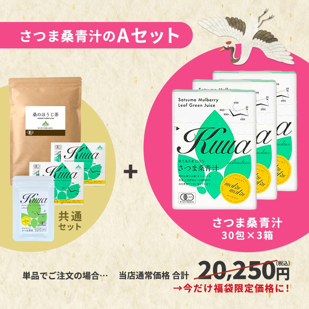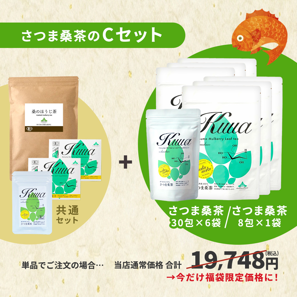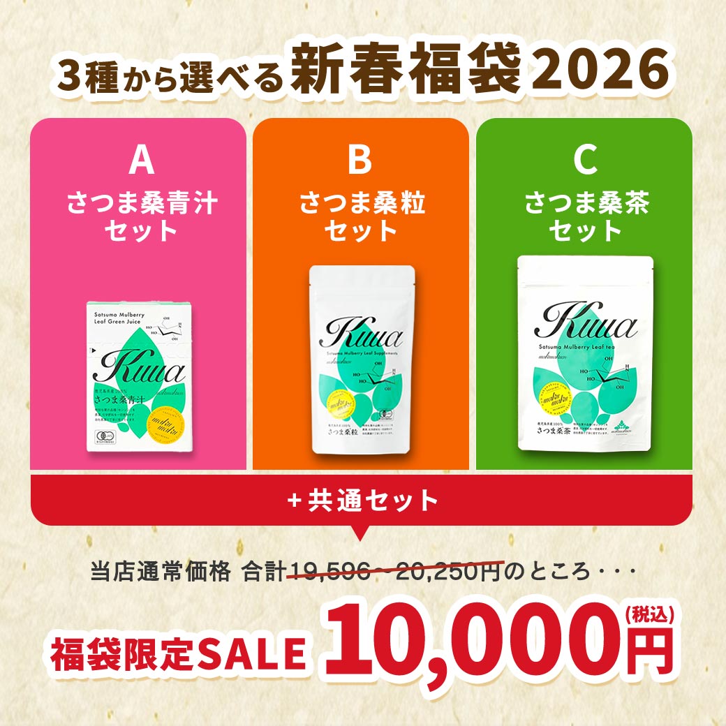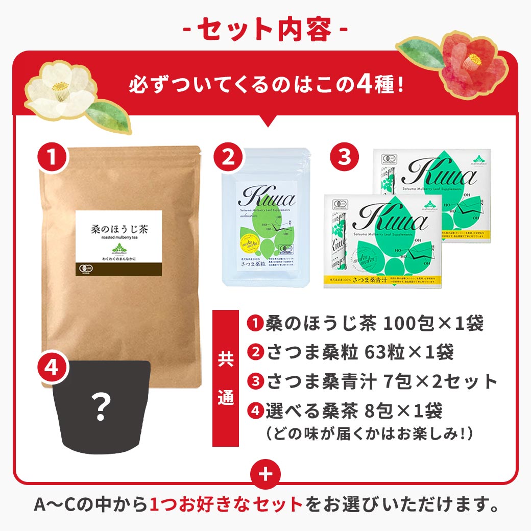 | 商品名│セット内容 | [共通商品] ・桑のほうじ茶(100包)×1袋 ・さつま桑粒(63粒)×1袋 ・さつま桑青汁(7包)×2セット [Aセット] ・さつま桑青汁(30包)×3箱 【商品詳細はコチラ】 [Bセット] ・さつま桑粒(270粒)×3袋 【商品詳細はコチラ】 [Cセット] ・さつま桑茶(30包)×6袋/さつま桑茶(8包)×1袋 【商品詳細はコチラ】 |