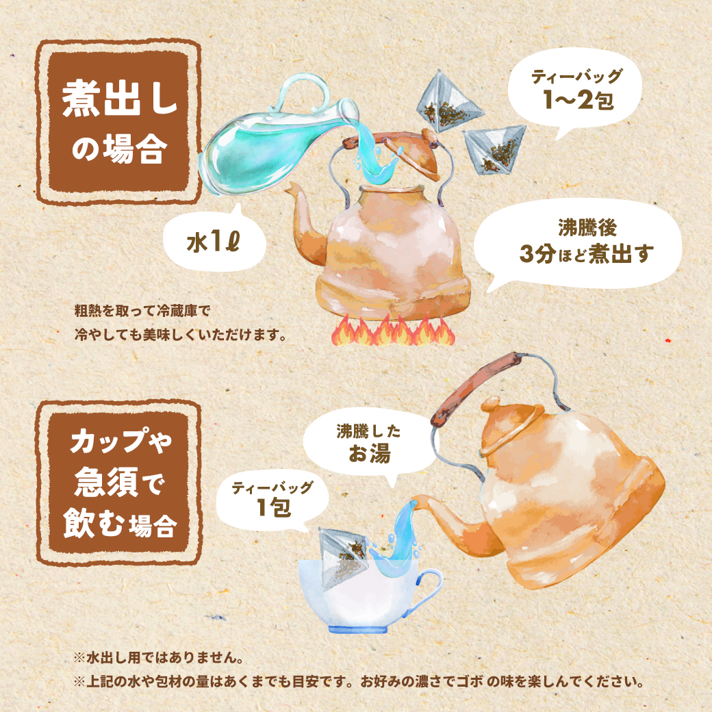 ※上記の水や包材の量はあくまでも目安です。お好みの濃さでごぼう茶を楽しんでください。