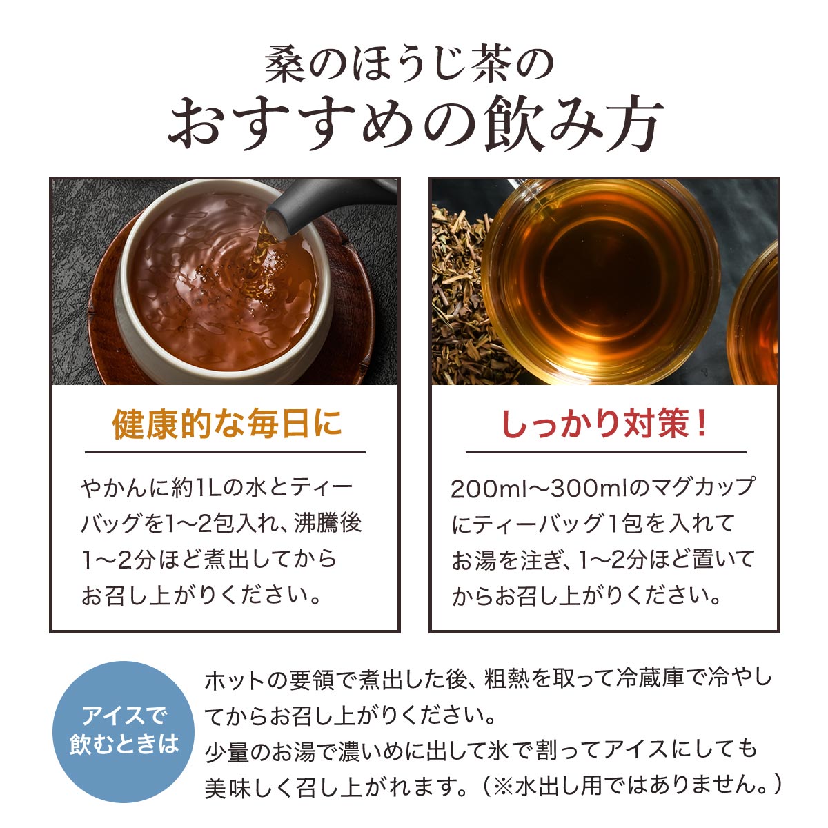 ・やかんに約1Lの水とティーバッグを1〜2包入れ、沸騰後1〜2分ほど煮出してお召し上がりください。粗熱を取って冷蔵庫で冷やしても美味しくいただけます。