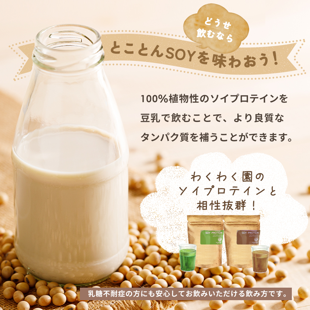 ※本プロテインに使用している大豆は、いずれも非遺伝子組換・残留農薬検査済みですので安心してお飲みください。 |