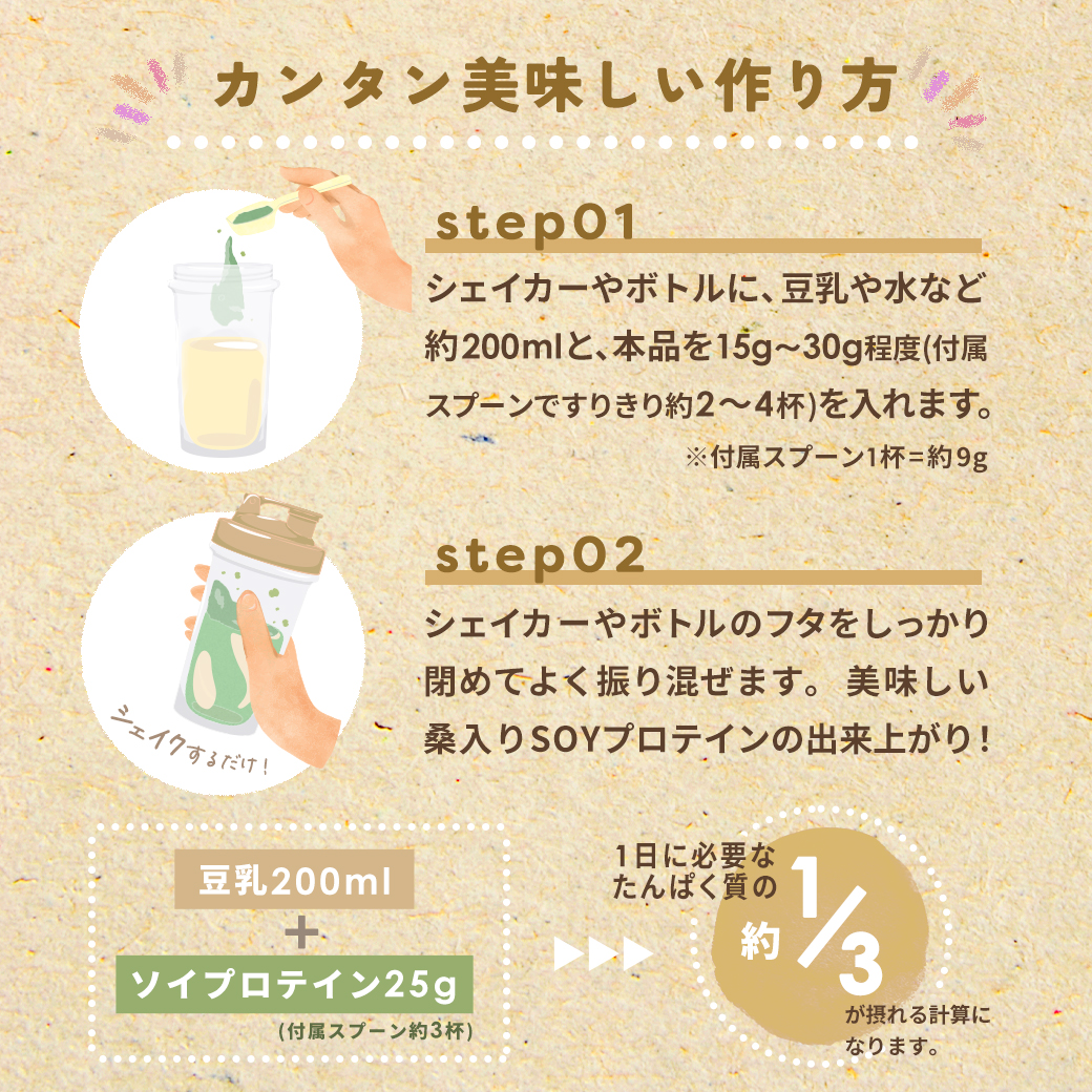 豆乳や水など約200mlに、15g~30g程度[付属スプーンですりきり2~4杯程度(※付属スプーン1杯=約9g)]を目安によく溶かしてお飲みください。シェイカーなどをご使用いただくと、よく混ざります。