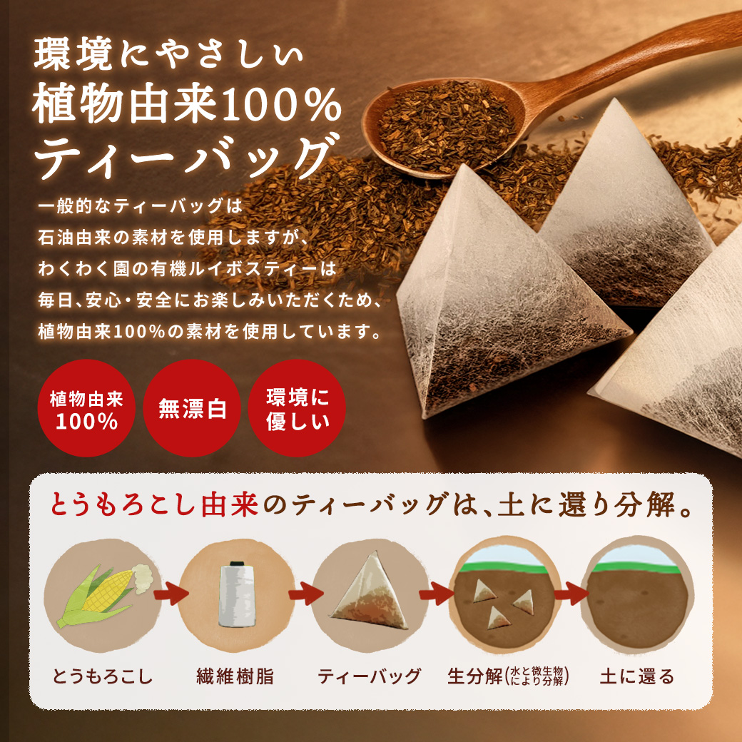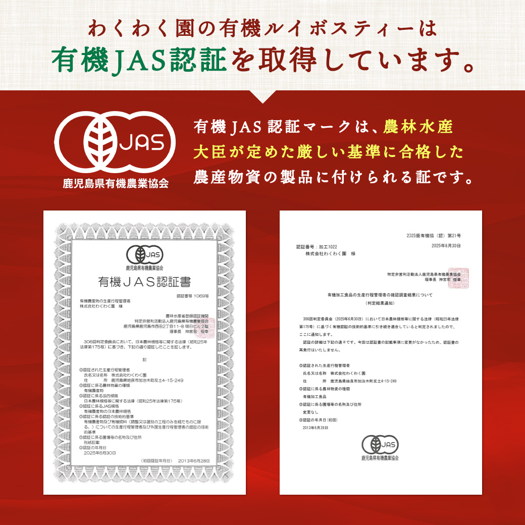 また、子どもからご年配の方まで安心してお楽しみいただける有機JAS認証を取得したオーガニックルイボスティーです。