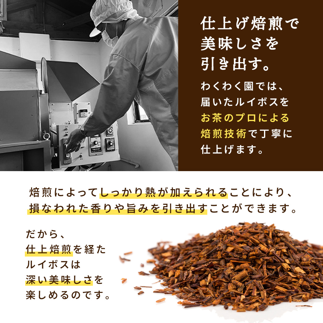 わくわく園で販売しているルイボスティーは、輸送を経て損なわれる香りや風味を再度引き立たせるために、自家焙煎にこだわりました。